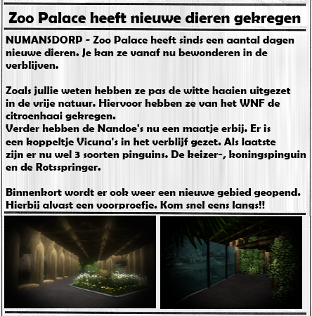 @ Jeweetwelwie, Knappe update! Je maakt je verblijven héél origineel. Je pinguin-verblijf is zéér mooi waarbij de dieren veel ruimte hebben en de bezoekers een mooi overizicht. Ook je krantenknipsel maakt je update mooi af. Maar misschien moet ik toch wel erbij zeggen (net zoals krieke668) dat die hekkens misschien kunnen aangepast worden, zoals een gaashek of draadhek... Maar dit weerhoudt me er niet van om te zeggen dat dit een knappe update is. Ik wens je nog veel succes!